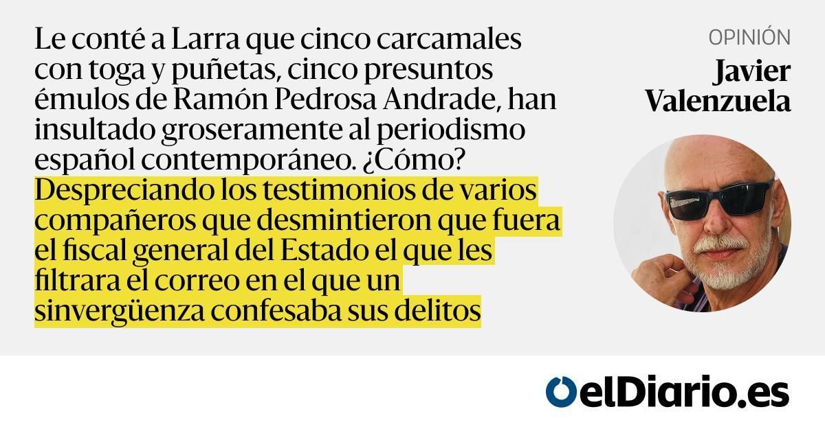 Le conté a Larra que cinco carcamales con toga y puñetas, cinco presuntos émulos de Ramón Pedrosa Andrade, han insultado groseramente al periodismo español contemporáneo. ¿Cómo? Despreciando los testimonios de varios compañeros que desmintieron que fuera el fiscal general del Estado el que les filtr...