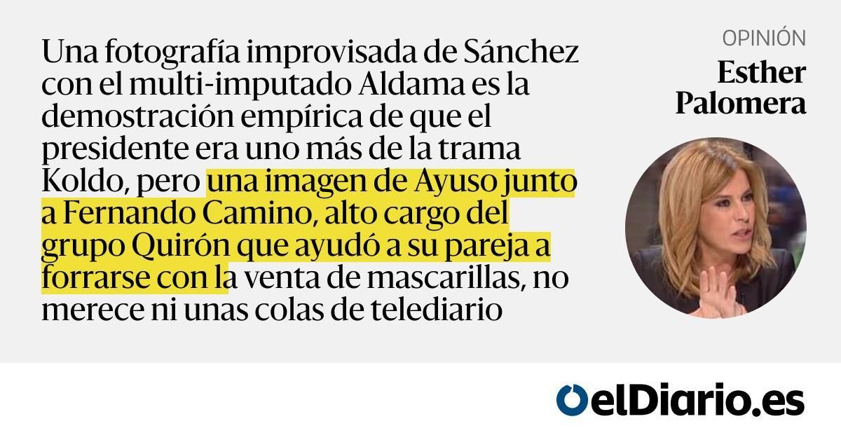Una fotografía improvisada de Sánchez con el multi-imputado Aldama es la demostración empírica de que el presidente era uno más de la trama Koldo, pero una imagen de Ayuso junto a Fernando Camino, alto cargo del grupo Quirón que ayudó a su pareja a forrarse con la venta de mascarillas no merece ni u...