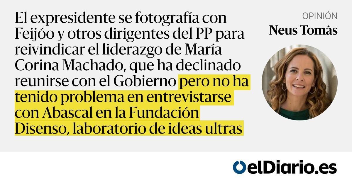 El expresidente se fotografía con Feijóo y otros dirigentes del PP para reivindicar el liderazgo de María Corina Machado, que ha declinado reunirse con el Gobierno pero no ha tenido problema en entrevistarse con Abascal en la Fundación Disenso, laboratorio de ideas ultras — María Corina Machado just...