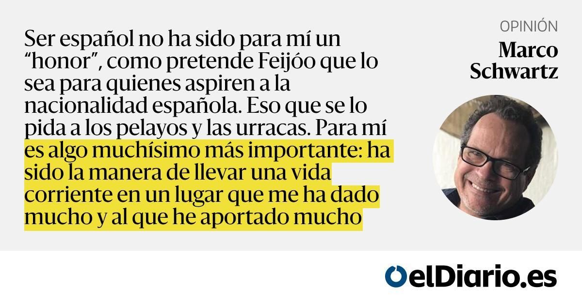 Ser español no ha sido para mí un honor, como pretende Feijóo que lo sea para quienes aspiren a la nacionalidad española. Eso que se lo pida a los pelayos y las urracas. Para mí es algo muchísimo más importante: ha sido la manera de llevar una vida corriente en un lugar que me ha dado mucho y al que...