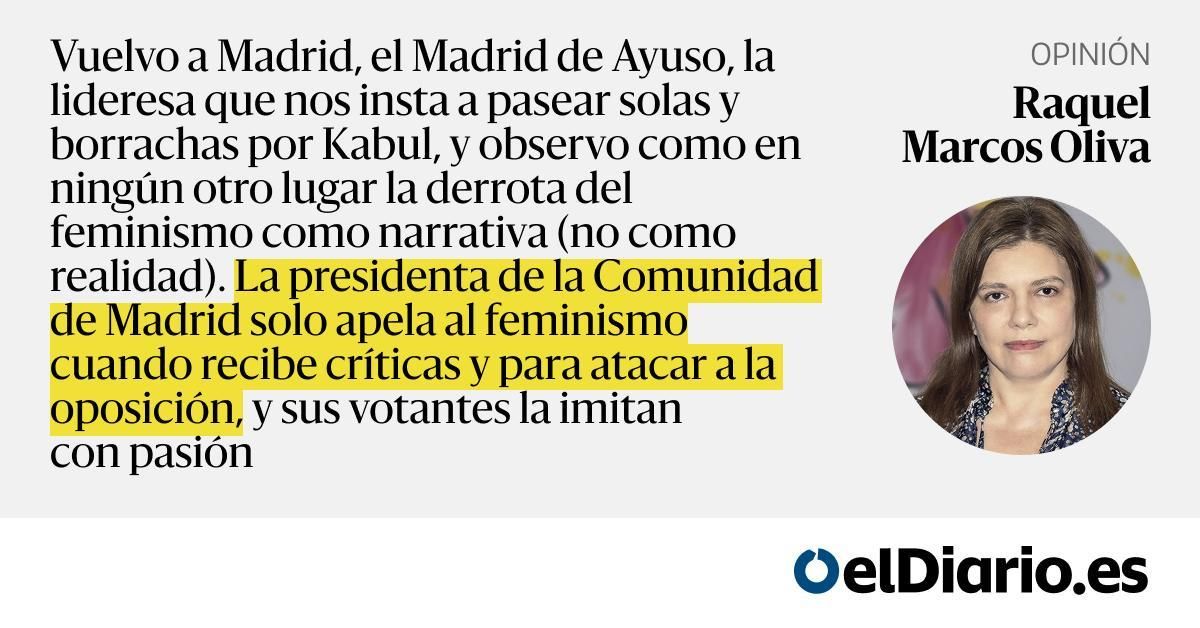 Vuelvo a Madrid, el Madrid de Ayuso, la lideresa que nos insta a pasear solas y borrachas por Kabul, y observo como en ningún otro lugar la derrota del feminismo como narrativa (no como realidad). La presidenta de la Comunidad de Madrid solo apela al feminismo cuando recibe críticas y para atacar a...