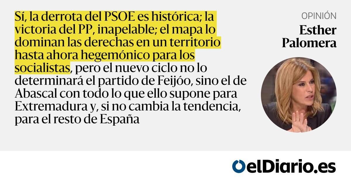 Sí, la derrota del PSOE es histórica; la victoria del PP, inapelable; el mapa lo dominan las derechas en un territorio hasta ahora hegemónico para los socialistas, pero el nuevo ciclo no lo determinará el partido de Feijóo, sino el de Abascal con todo lo que ello supone para Extremadura y, si no cam...