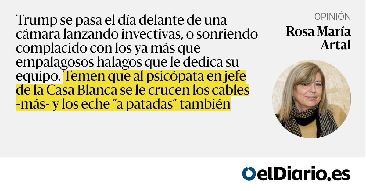 Trump se pasa el día delante de una cámara lanzando invectivas, o sonriendo complacido con los ya más que empalagosos halagos que le dedica su equipo. Temen que al psicópata en jefe de la Casa Blanca se le crucen los cables -más- y los eche “a patadas” también...