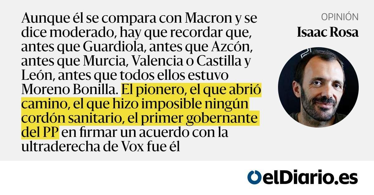 Aunque él se compara con Macron y se dice moderado, hay que recordar que, antes que Guardiola, antes que Azcón, antes que Murcia, Valencia o Castilla y León, antes que todos ellos estuvo Moreno Bonilla. El pionero, el que abrió camino, el que hizo imposible ningún cordón sanitario, el primer goberna...