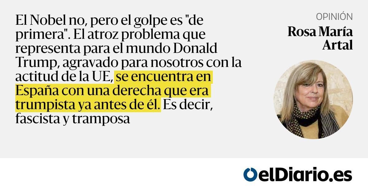El Nobel no, pero el golpe es “de primera”. El atroz problema que representa para el mundo Donald Trump, agravado para nosotros con la actitud de la UE, se encuentra en España con una derecha que era trumpista ya antes de él. Es decir, fascista y tramposa...