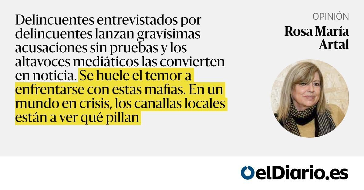 Delincuentes entrevistados por delincuentes lanzan gravísimas acusaciones sin pruebas y los altavoces mediáticos las convierten en noticia. Se huele el temor a enfrentarse con estas mafias. En un mundo en crisis, los canallas locales están a ver qué pillan...
