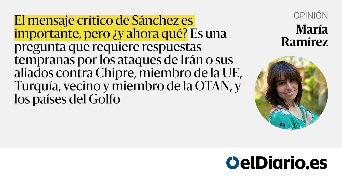 El mensaje crítico de Sánchez es importante, pero ¿y ahora qué? Es una pregunta que requiere respuestas tempranas por los ataques de Irán o sus aliados contra Chipre, miembro de la UE, Turquía, vecino y miembro de la OTAN, y los países del Golfo — Starmer: “Todos recordamos los errores de Irak, no v...