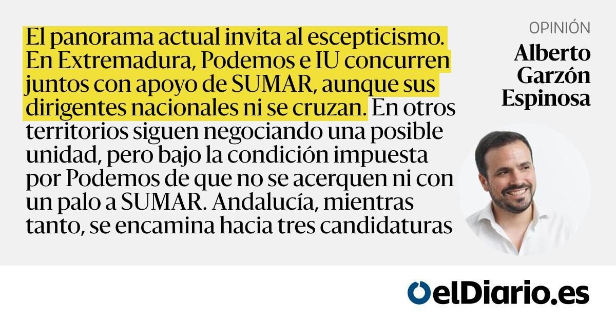 El panorama actual invita al escepticismo. En Extremadura, Podemos e IU concurren juntos con apoyo de SUMAR, aunque sus dirigentes nacionales ni se cruzan. En otros territorios siguen negociando una posible unidad, pero bajo la condición impuesta por Podemos de que no se acerquen ni con un palo a SU...