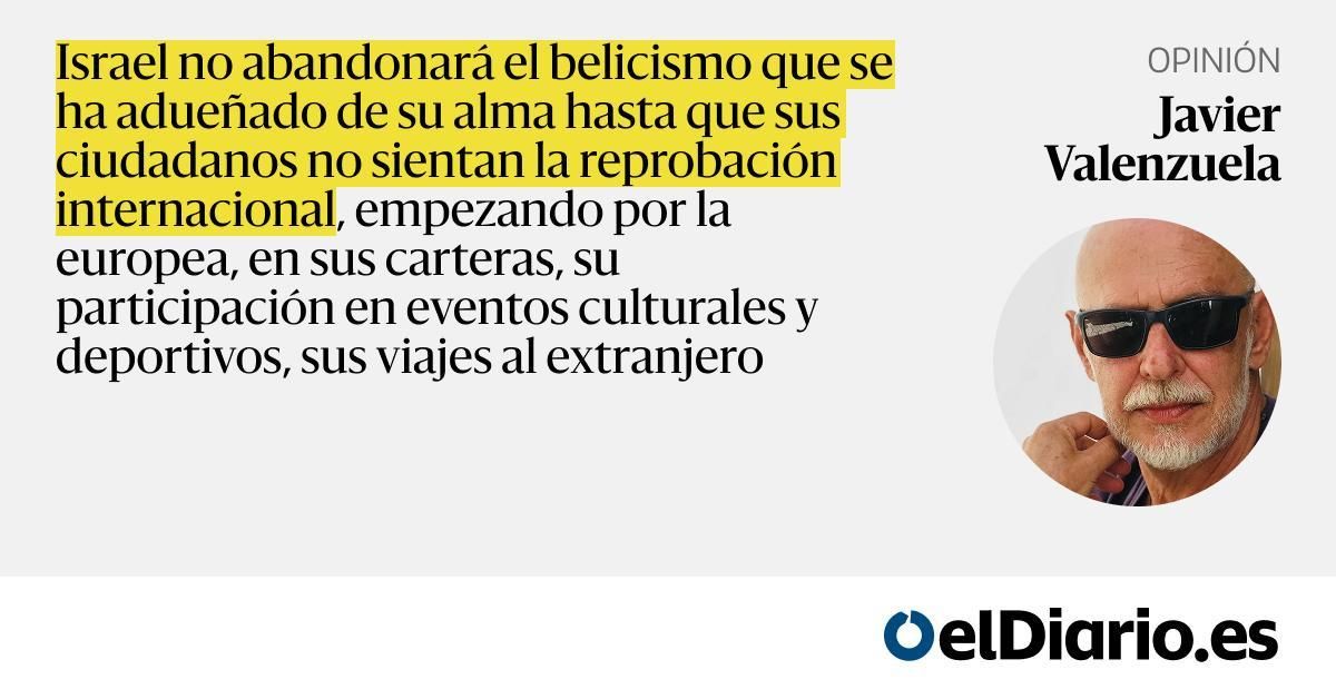 Israel no abandonará el belicismo que se ha adueñado de su alma hasta que sus ciudadanos no sientan la reprobación internacional, empezando por la europea, en sus carteras, su participación en eventos culturales y deportivos, sus viajes al extranjero...