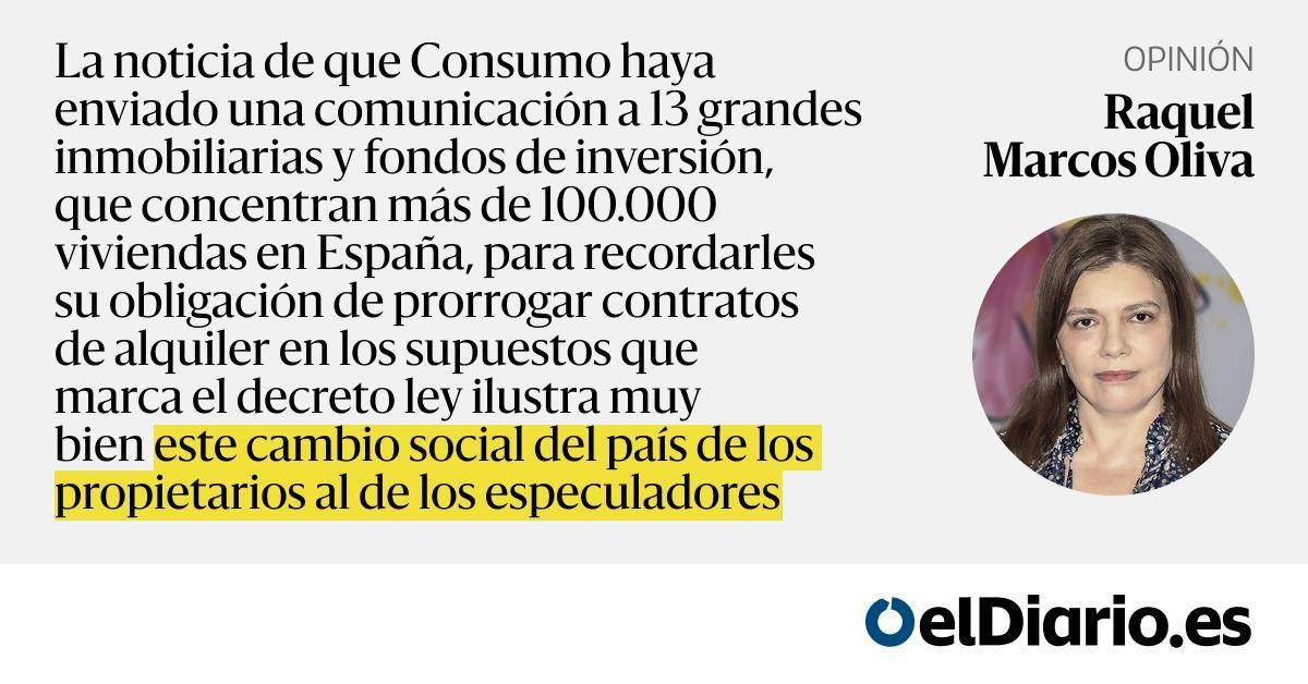 La noticia de que el Ministerio de Consumo haya enviado una comunicación a 13 grandes inmobiliarias y fondos de inversión, que concentran más de 100.000 viviendas en España, para recordarles su obligación de prorrogar contratos de alquiler en los supuestos que marca el decreto ley ilustra muy bien e...