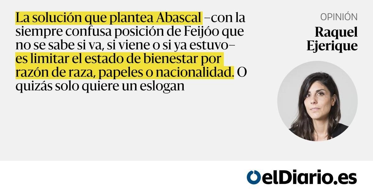 La solución que plantea Abascal –con la siempre confusa posición de Feijóo que no se sabe si va, si viene o si ya estuvo– es limitar el estado de bienestar por razón de raza, papeles o nacionalidad. O quizás solo quiere un eslogan...