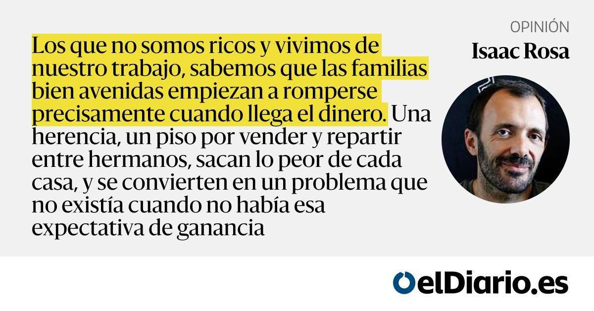 Los que no somos ricos y vivimos de nuestro trabajo, sabemos que las familias bien avenidas empiezan a romperse precisamente cuando llega el dinero. Una herencia, un piso por vender y repartir entre hermanos, sacan lo peor de cada casa, y se convierten en un problema que no existía cuando no había e...