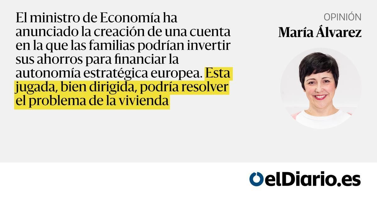 El ministro de Economía ha anunciado la creación de una cuenta en la que las familias podrían invertir sus ahorros para financiar la autonomía estratégica europea. Esta jugada, bien dirigida, podría resolver el problema de la vivienda — Economía diseña una cuenta bancaria para que los españoles invi...