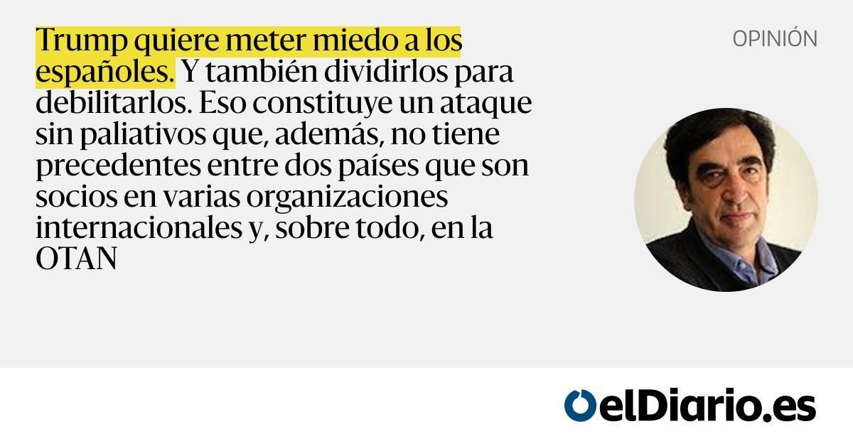 Trump quiere meter miedo a los españoles. Y también dividirlos para debilitarlos. Eso constituye un ataque sin paliativos que, además, no tiene precedentes entre dos países que son socios en varias organizaciones internacionales y, sobre todo, en la OTAN. Ante ese ataque no cabe más que contraatacar...