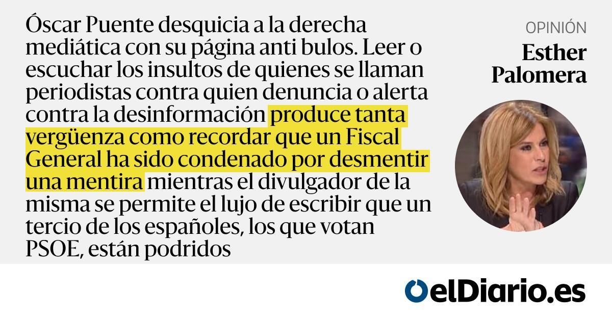 Óscar Puente desquicia a la derecha mediática con su página anti bulos. Leer o escuchar los insultos de quienes se llaman periodistas contra quien denuncia o alerta contra la desinformación produce tanta vergüenza como recordar que un Fiscal General ha sido condenado por desmentir una mentira mientr...