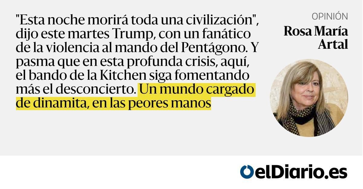 “Esta noche morirá toda una civilización”, dijo este martes Trump, con un fanático de la violencia al mando del Pentágono. Y pasma que en esta profunda crisis, aquí, el bando de la Kitchen siga fomentando más el desconcierto. Un mundo cargado de dinamita, en las peores manos....
