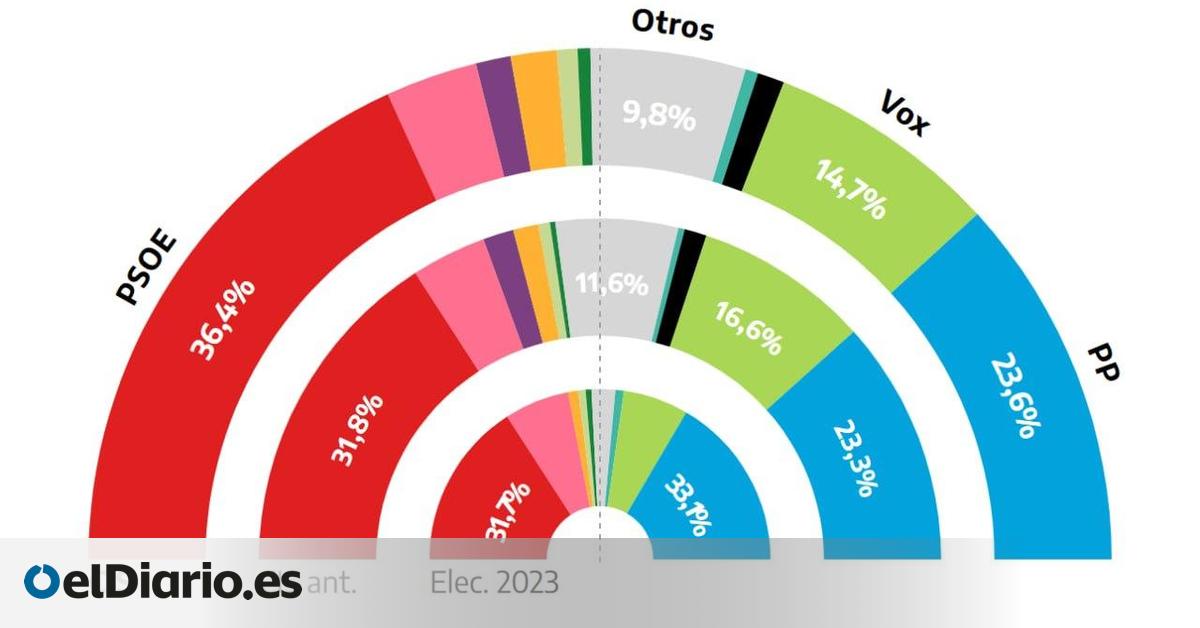 El barómetro del CIS da como ganador de las elecciones a los socialistas con el 36,4% y sitúa al PP como segunda fuerza con el 23,6%. Sumar también desciende y obtendría el 5,8% frente al 7,1% de marzo — Feijóo, sobre los gritos de “¡fuera la mona!” contra Delcy Rodríguez en el acto de Ayuso: “No es...