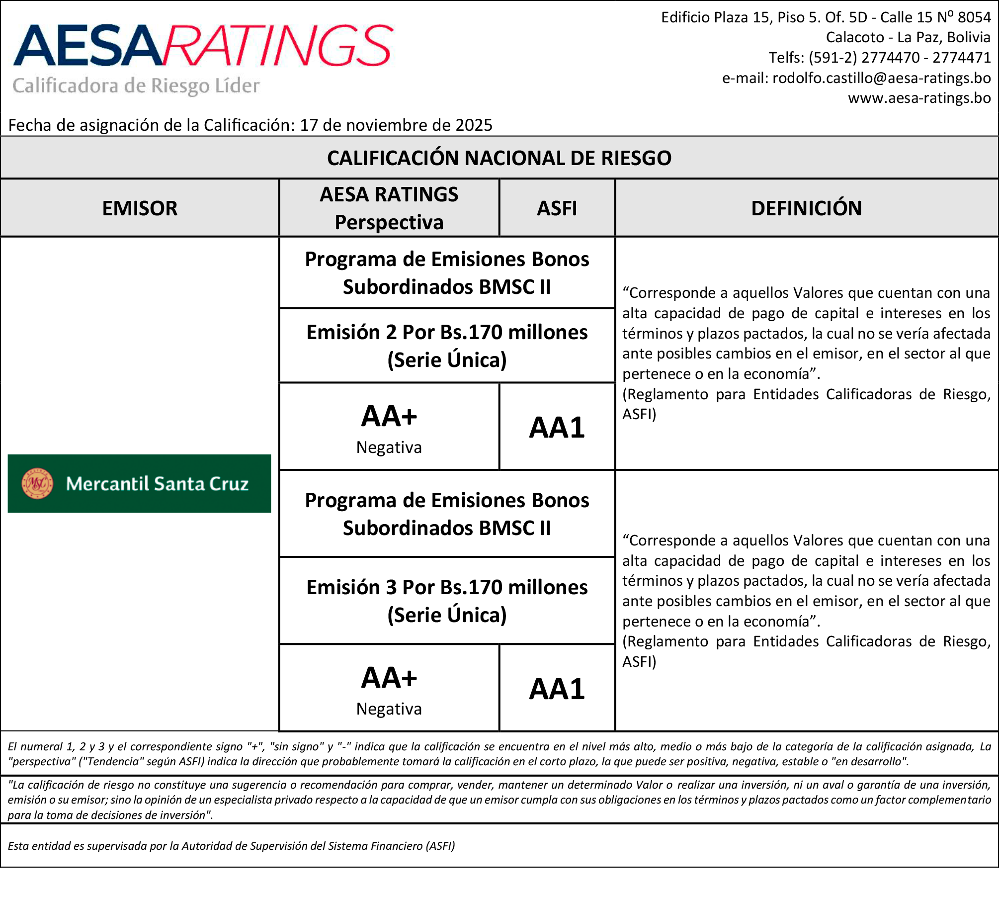 AESA RATINGS – BANCO MERCANTIL SANTA CRUZ