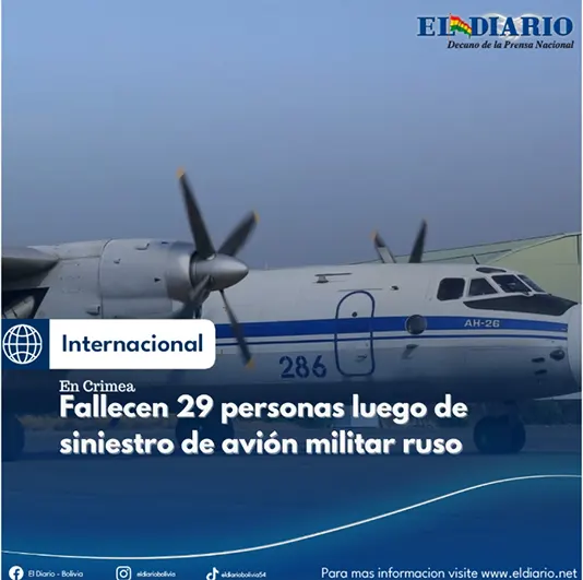 Un avión militar ruso se estrelló en la Crimea anexionada, y los seis tripulantes y 23 pasajeros a bordo fallecieron, reportaron agencias noticiosas rusas a primera hora del miércoles, citando al Ministerio de Defensa del país....