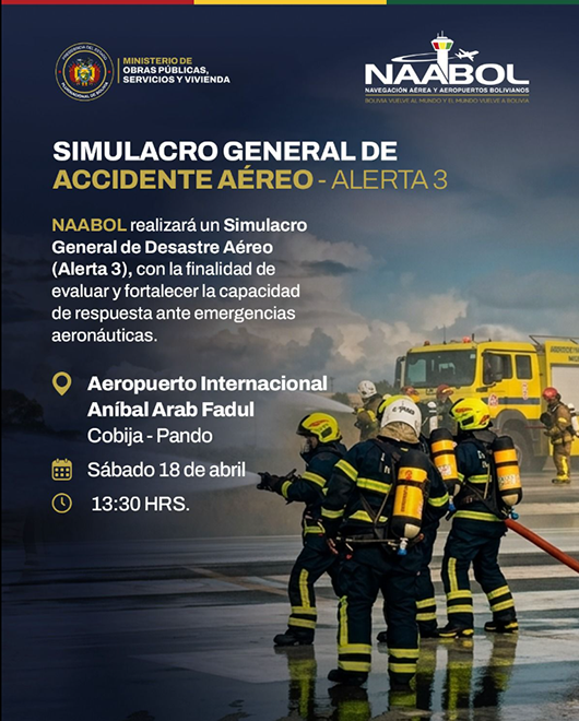 Mediante un comunicado oficial Navegación Aérea y Aeropuertos Bolivianos (NAABOL) informa que este sábado, el Aeropuerto Aníbal Arab Fadul de la ciudad de Cobija, en el departamento de Pando, será el escenario de un Simulacro de Accidente Aéreo – Alerta 3. La actividad, programada para iniciar a las...