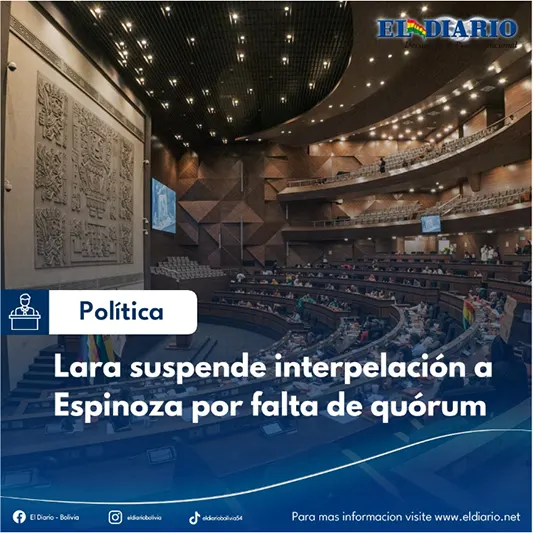 Al no existir quórum en la Cámara de Senadores, además de no contar con la presencia del ministro de Economía, Gabriel Espinoza y varios miembros de la directiva parlamentaria, el presidente nato de la Asamblea Legislativa Plurinacional (ALP), Edmand Lara, determinó suspender la sesión convocada par...