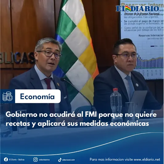 El Gobierno descarta acudir al Fondo Monetario Internacional (FMI), debido a que implica aplicar recetas y afectar a las familias más vulnerables, por lo tanto mantendrán sus metas de implementar sus políticas para mejorar la economía nacional y en beneficio de la población, de acuerdo al ministro d...