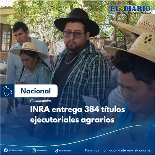 El Instituto Nacional de Reforma Agraria (INRA) entregó 384 títulos ejecutoriales agrarios en los municipios de Santivañez y Tapacarí, en el departamento de Cochabamba. (ABI)...