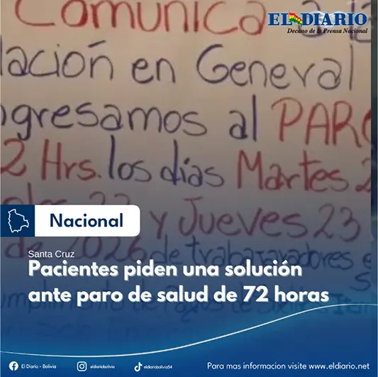 La medida de presión asumida por el sector salud de sostener un paro de 72 horas está generando serias dificultades para pacientes que requieren atención médica en la ciudad de Santa Cruz de la Sierra. Los afectados denunciaron la suspensión de consultas, retraso en tratamientos y falta de servicios...