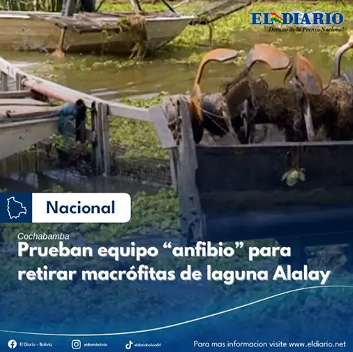 Las pruebas con un equipo denominado “anfibio” continúan en la laguna Alalay para evaluar su eficacia en la cosecha de macrófitas flotantes y enraizadas mediante un sistema de succión. (Cochabamba, agencias)...