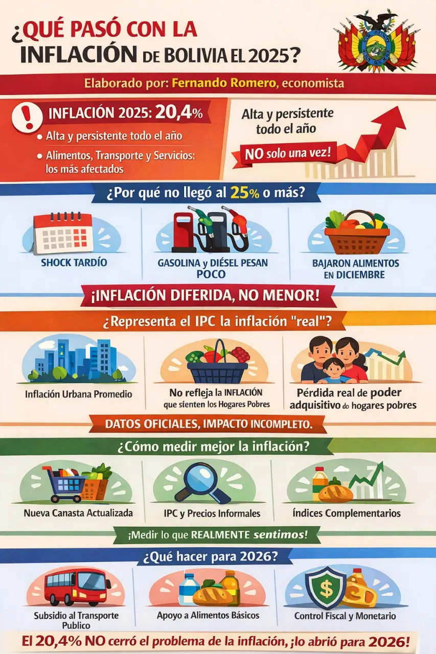 Después de la eliminación de la subvención a la gasolina y diésel, las familias bolivianas gastan más en alimentos y transporte, pero todavía el shock de la inflación a raíz de esta determinación recién se verá en el primer trimestre de 2026. La inflación del 20,4% en 2025 no cuenta toda la historia...