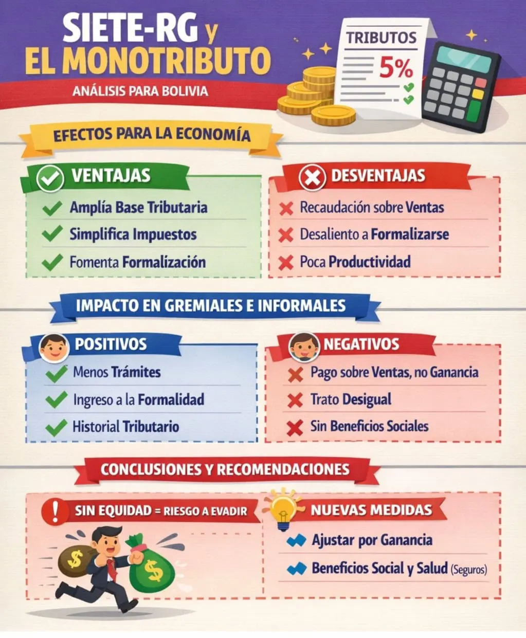 El planteamiento del monotributo establecido en el Decreto Supremo 5503 tiene rasgos positivos, pero también negativos, de acuerdo al análisis realizado por el analista económico Fernando Romero y los gremialistas ya pusieron sus reparos. Para el analista económico Fernando Romero los efectos en la...