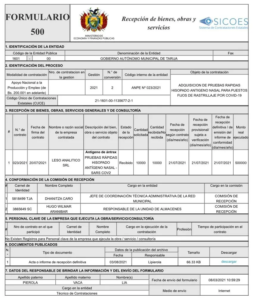 Las actas de entrega, documentación oficial del Sistema de Contratación Estatal (Sicoes) muestran que la Alcaldía de Tarija, compró pruebas rápidas para detectar covid-19 con un presunto sobreprecio de 631.000 bolivianos. La administración municipal de Potosí adquirió estos insumos a la mitad del pr...