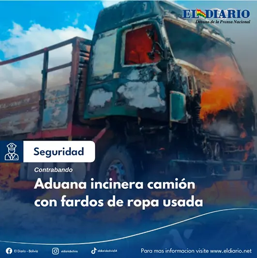 La Aduana Nacional incineró un camión con fardos de ropa usada de contrabando durante un operativo de control en rutas alternas de la comunidad de Chocorozi, en La Paz. La acción se asumió debido a que comunarios, con apoyo de maquinaria pesada, intentaron recuperar el vehículo y su carga....