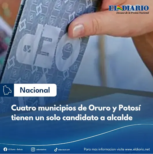 El vocal del Tribunal Supremo Electoral (TSE), Carlos Alberto Goitia, informó que en las próximas elecciones subnacionales cuatro municipios del país acudirán a las urnas con candidato único a la Alcaldía: tres en el departamento de Oruro y uno en Potosí. (Erbol)...