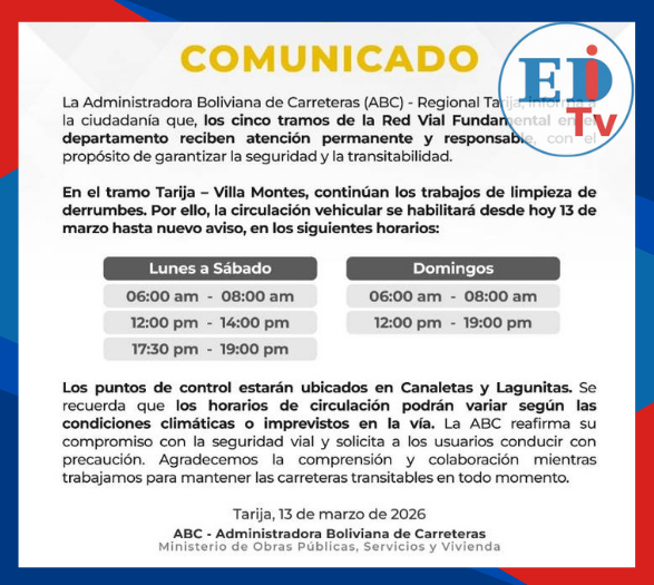¡Atención! Estos son los horarios de paso en la ruta Tarija -Villa Montes (10:13) 17 mar 2026, 14:29 ... Redirecting to full article...