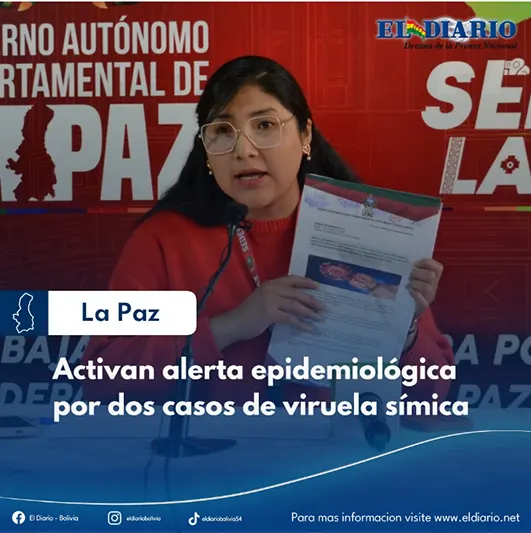 La jefa de Epidemiología e Investigación del Servicio Departamental de Salud (Sedes) de La Paz, Jhoselyn Mamani, informó que se detectaron dos casos de viruela símica (Mpox) en el municipio paceño, por lo que activó la emisión de una alerta epidemiológica y el refuerzo de la vigilancia sanitaria en...