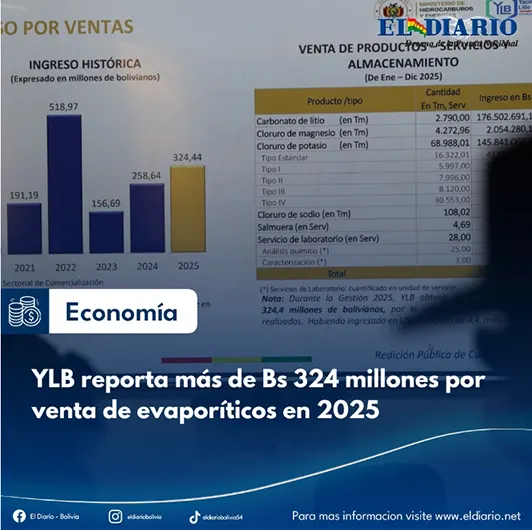 El presidente ejecutivo de Yacimientos de Litio Bolivianos (YLB), Sergio Soliz Gómez, informó que la estatal generó ventas de más de Bs 324 millones, por la comercialización de carbonato de litio y cloruro de potasio, a los mercados nacional e internacional, durante la gestión 2025....
