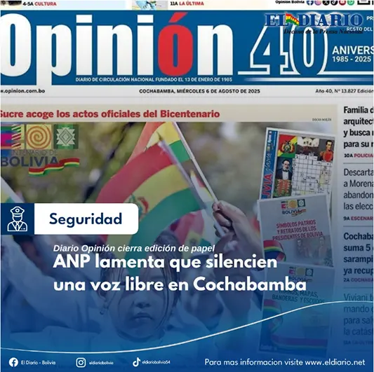 La Asociación Nacional de la Prensa (ANP), que representa a los principales medios escritos de Bolivia, lamenta profundamente la suspensión de las ediciones en papel del periódico Opinión y hace un llamado a las instituciones vallunas para respaldar el trabajo del medio que defiende los intereses so...