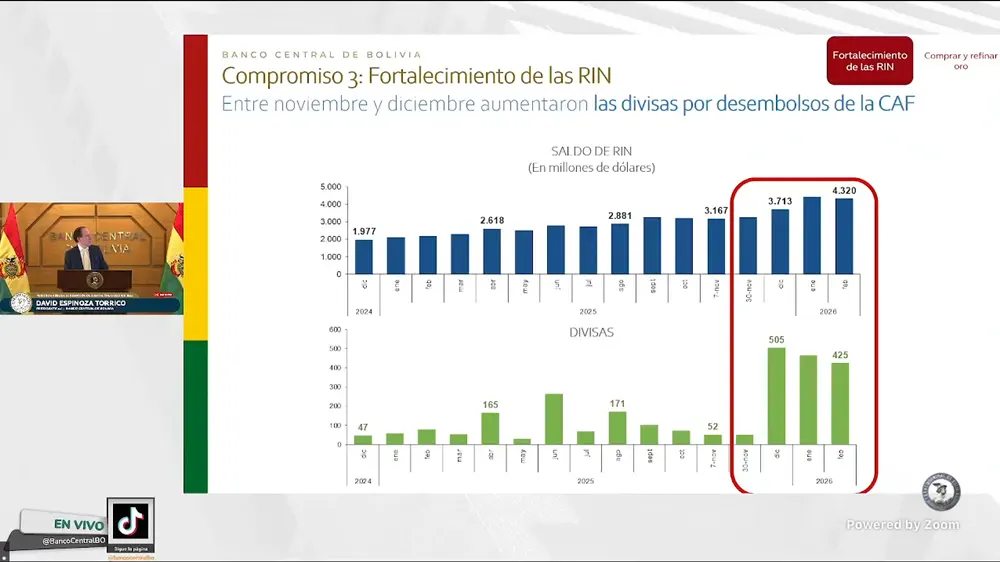Reservas Internacionales Netas (RIN) subieron en los últimos meses a 500 millones de dólares en divisas, con desembolsos de la CAF, pero el pago de la deuda externa bajó la cifra a 52 millones, en los últimos días habría subido a más de 100 millones. El ministro de Economía y Finanzas Públicas, Gabr...