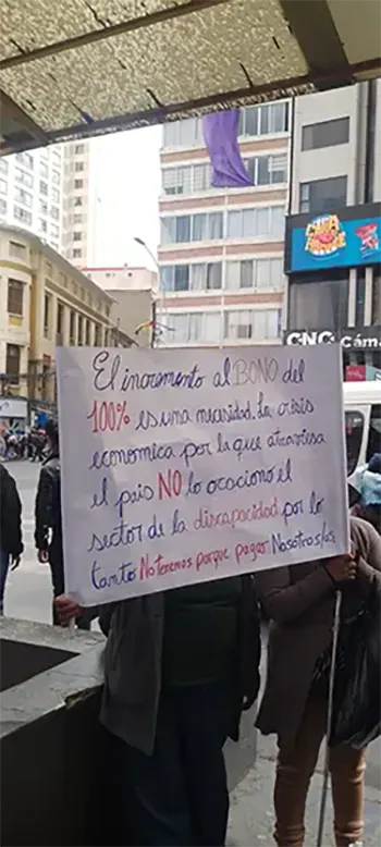 Una nueva organización de personas con discapacidad visual instaló una protesta en las puertas del Ministerio de Economía, ubicado en la intersección de la Avenida Mariscal Santa Cruz y la calle Loayza en la ciudad de La Paz. Los movilizados exigen el incremento del bono anual a la indigencia y denu...
