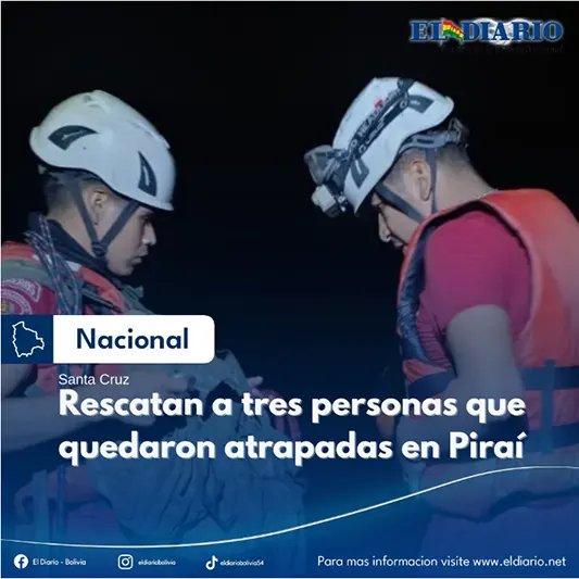 Los bomberos de la Policía rescataron anoche a tres personas del río Piraí, en Santa Cruz. Según el reporte de los familiares, este grupo no podía salir de la zona debido al aumento del caudal. Estas personas estaban atrapadas, según el reporte, en una zona conocida como Remanso. (Santa Cruz, agenci...