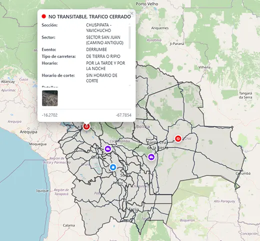 La Administradora Boliviana de Carreteras informa que el paso vehicular está completamente cerrado hasta nuevo aviso en los sectores de San Juan y Solario, dentro del tramo Unduavi – Chulumani, específicamente en el subtramo Chuspipata – Yolosita, en la ruta hacia los Yungas del departamento de La P...