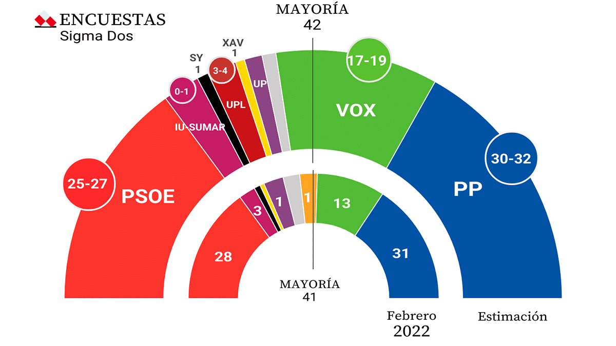 Los populares conseguirían crecer en votos y entre 30-32 procuradores, mientras que los de Abascal escalarían de 13 a entre 17-19 representantes...