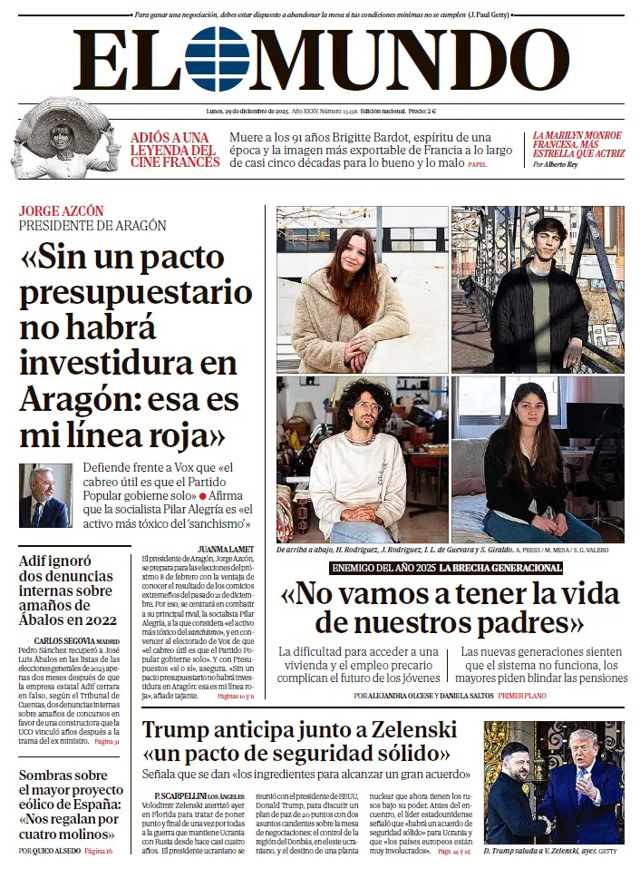 Portada de EL MUNDO del lunes 29 de diciembre de 2025