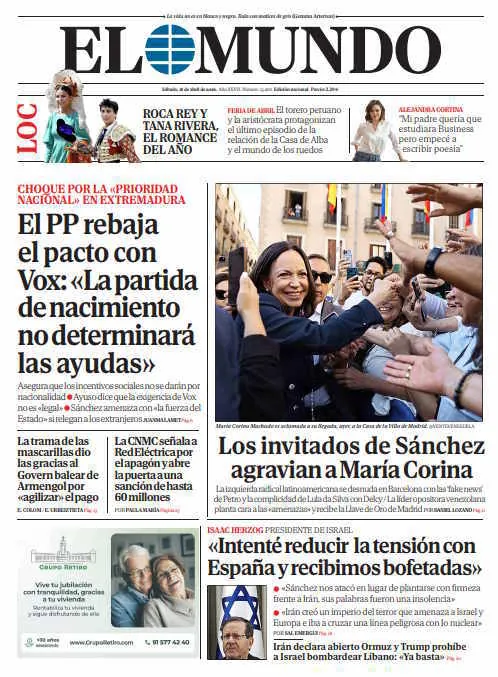 Portada de EL MUNDO del sábado 18 de abril de 2026