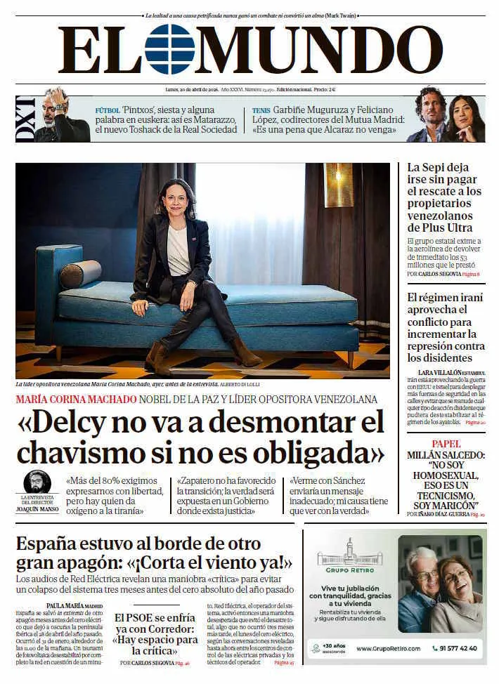 Portada de EL MUNDO del lunes 20 de abril de 2026