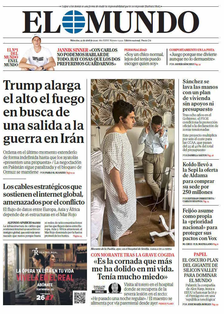 Portada de EL MUNDO del miércoles 22 de abril de 2026. Disponible en Orbyt desde las 23.30h. y cada día en tu quiosco, la mejor información siempre con EL MUNDO. Suscríbete aquí a PREMIUM y tendrás acceso ilimitado a todo el contenido...