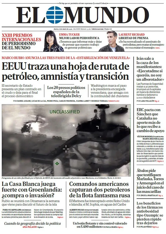 Portada de EL MUNDO del jueves 8 de enero de 2026. Disponible en Orbyt desde las 23.30h. y cada día en tu quiosco, la mejor información siempre con EL MUNDO. Suscríbete aquí a PREMIUM y tendrás acceso ilimitado a todo el contenido...