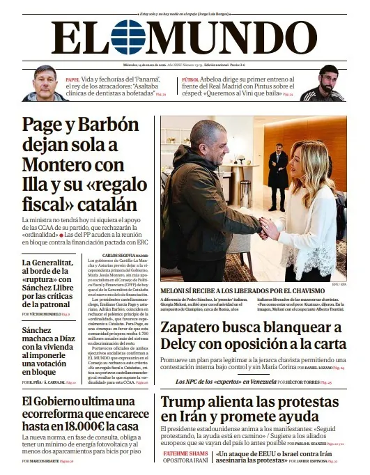Portada de EL MUNDO del miércoles 14 de enero de 2026