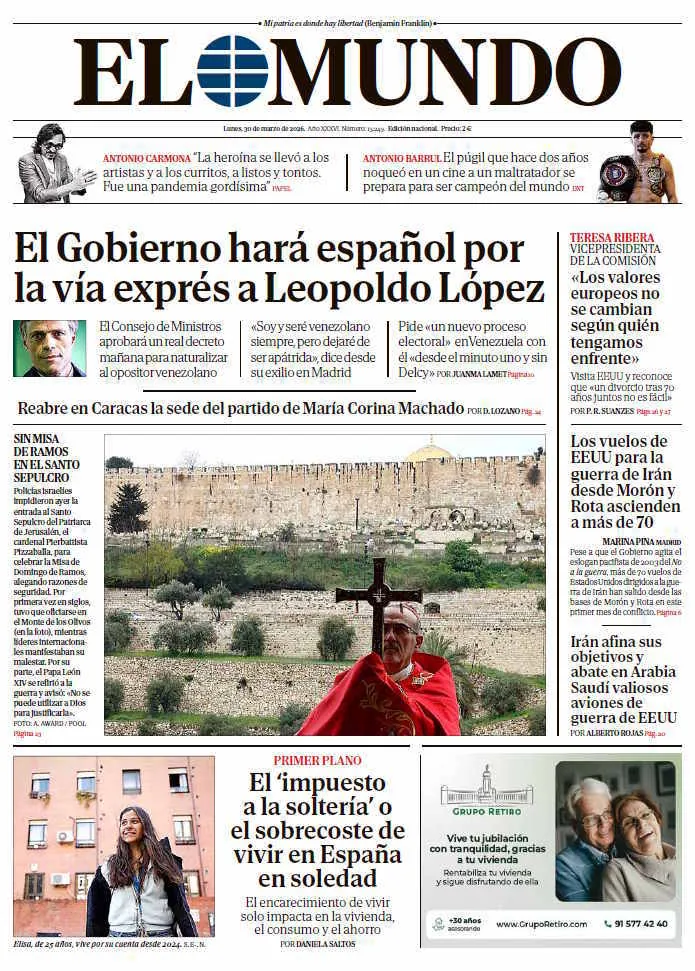 Portada de EL MUNDO del lunes 30 de marzo de 2026